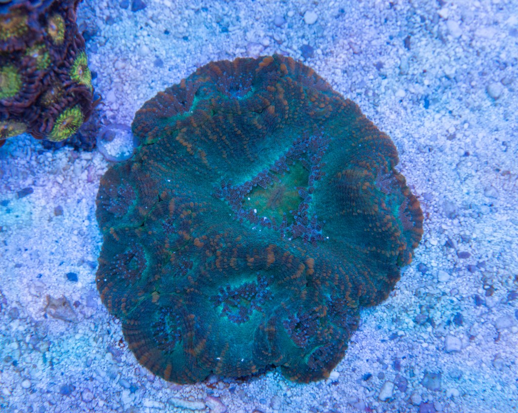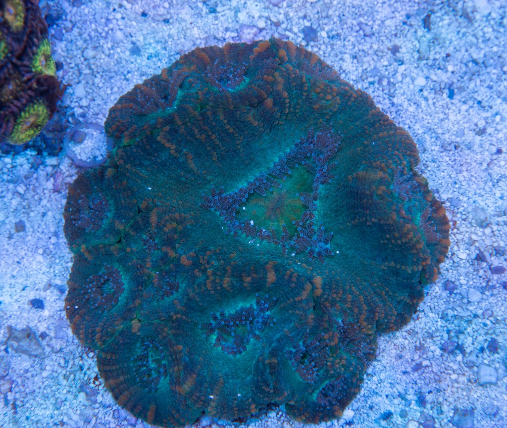 Notes: This is one of two Moseleya that I have, which appear to be a less common coral in the trade. I’ve seen it extend lengthy sweeper tentacles, which at one point was devouring my Scoly around 3-4 inches away.