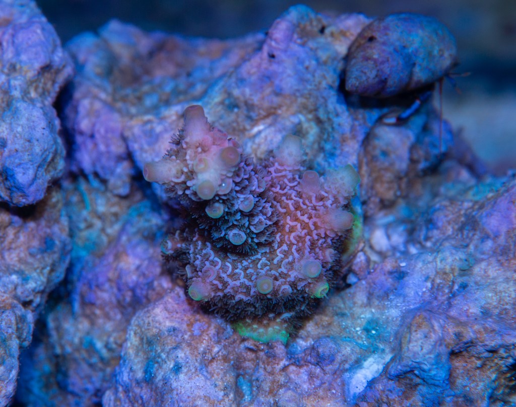 Notes: When I first got this Mille, I had it on a frag rack for quite some time. It ended up turning almost completely green until I mounted it in the 100g tank and it changed “back” to a peach color.