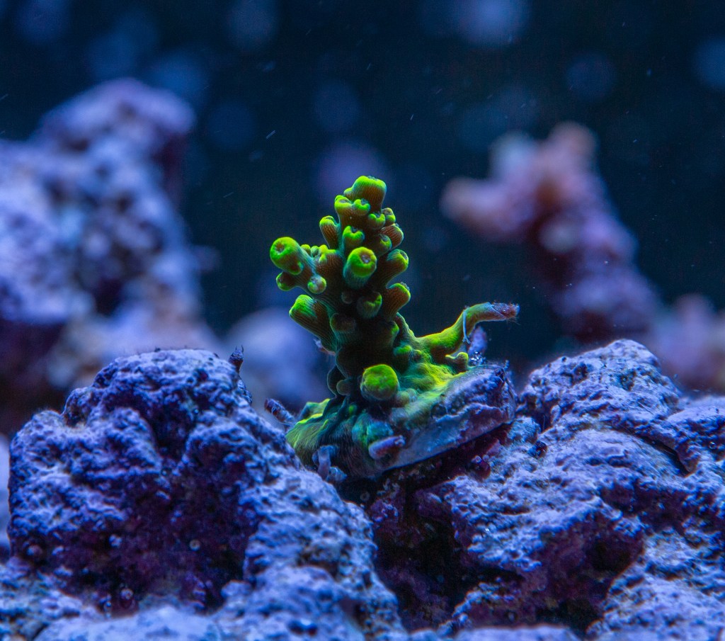 Description: A yellowish acropora under blue light, going towards green under white light.