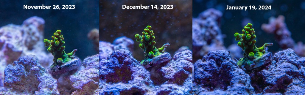 Notes: So far this has turned out to be a slow grower, although I almost lost it in the 65g mixed reef. Has since moved to the 100g reef and its making a comeback.