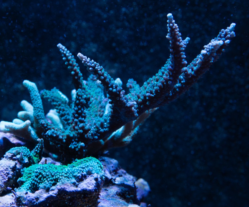 Top down view in the Max E-170 prior to moving to 100g mixed reef. Purple tips on the back is more of a disco light effect during the capture than true color. German Blue Monti behind the stag which makes the view a little confusing.