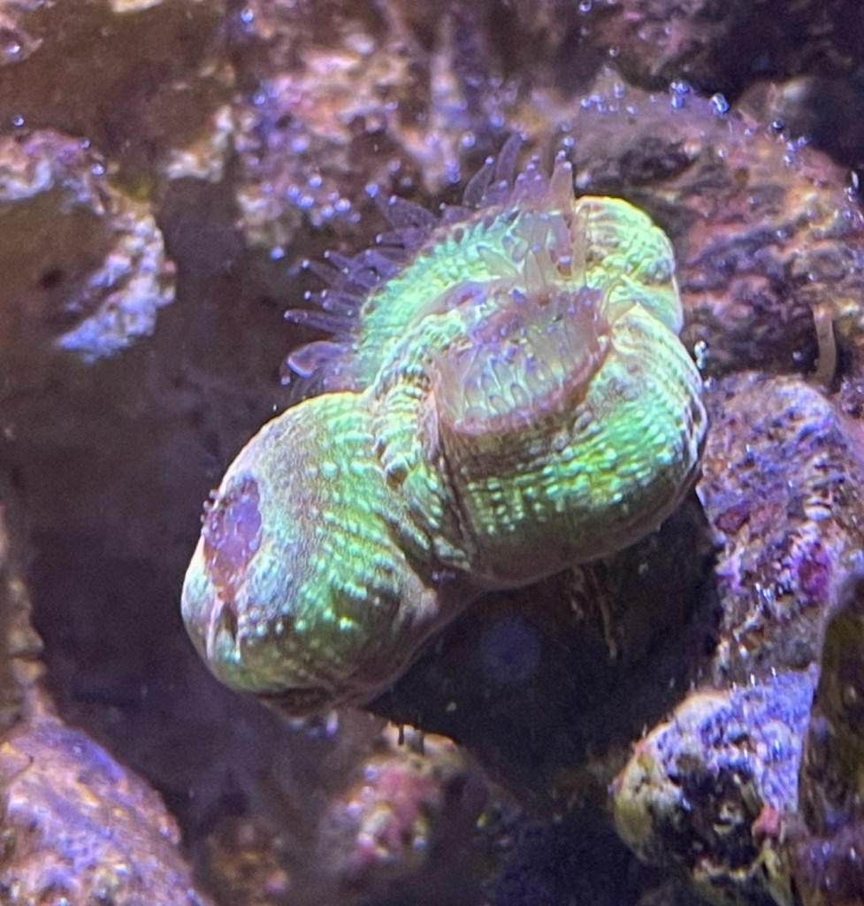 Notes: I almost lost this coral in a nano tank before moving it to the 100g. It looks to be coming back, and is now growing onto surrounding rock.